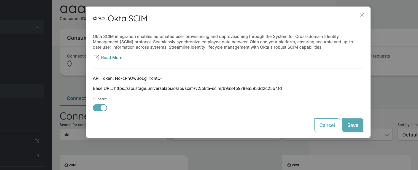 Obtain your API Token from your connection's metadata in uapi - the token used to authenticate SCIM requests