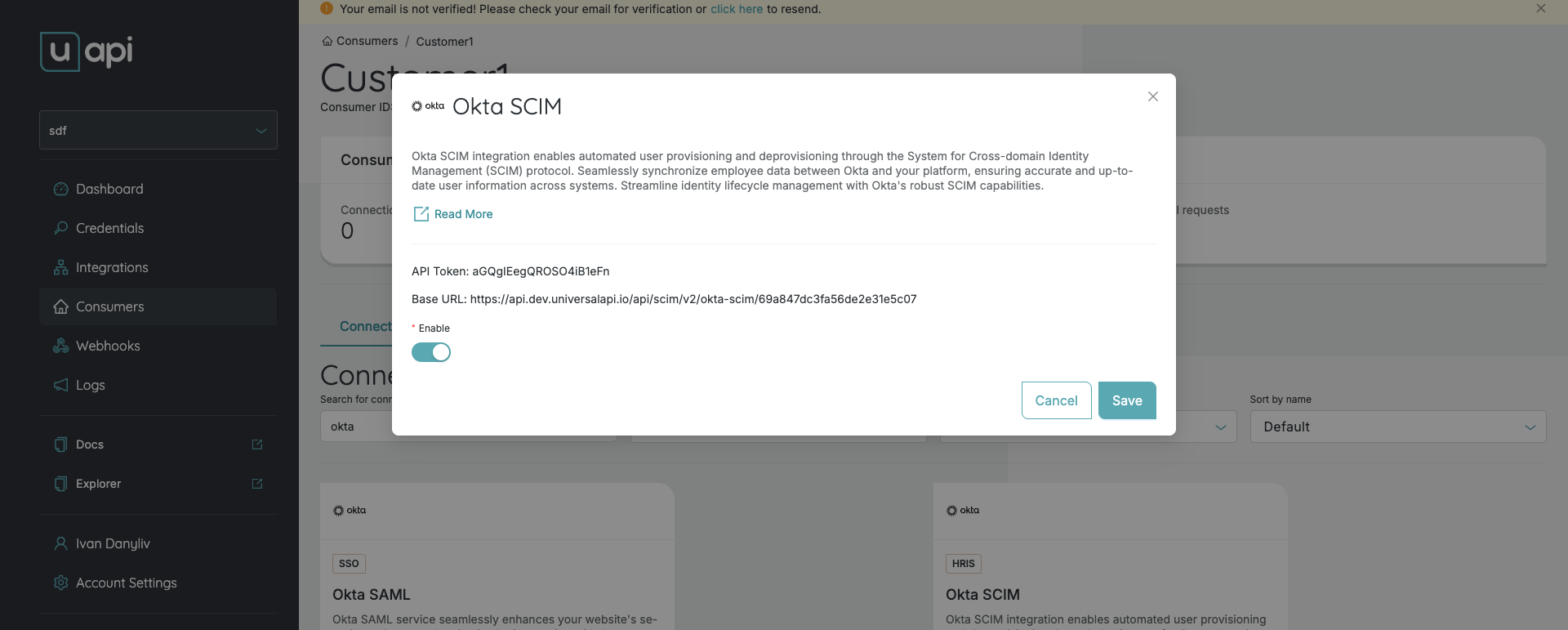 Obtain your API Token from the connection metadata in uapi - the token used to authenticate SCIM requests